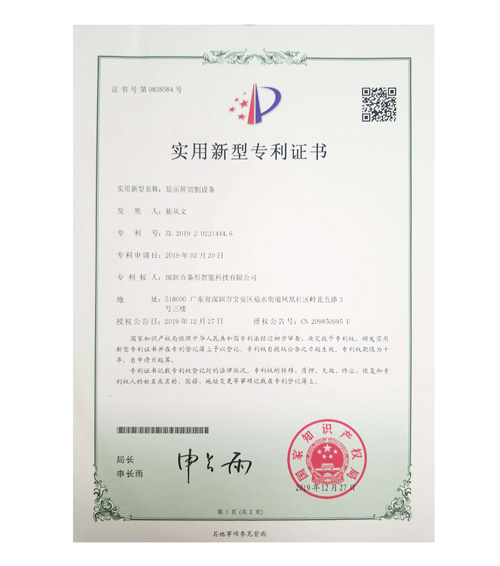 显示屏切割设备专利证书