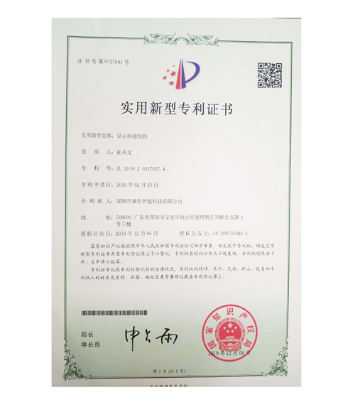 显示屏涂胶机专利证书